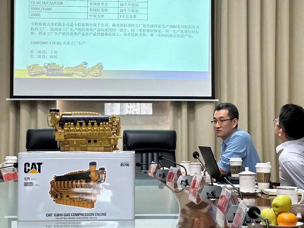 会议进行过程中,利星行机械船机销售经理翟宏强先生针对镇江船厂尤为关注的 CAT 发电机组生产周期的优化以及产品证书的完善等问题,给予了详尽的解答。无独有偶,船机资深应用经理戎恺先生也慷慨分享了 CAT 的最新产品以及研发进度。