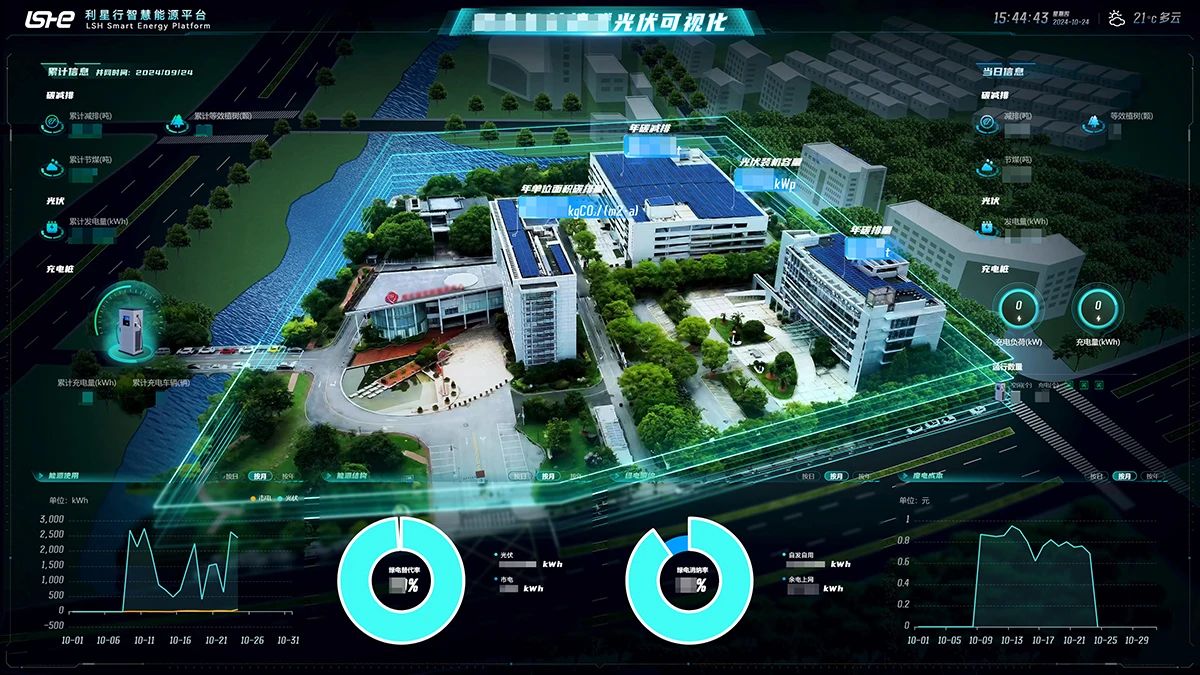 通过利星行机械能源自主研发的智慧管理平台,以高空俯视视角呈现每幢楼的光伏装机容量、年碳排量、年碳减排以及年单位面积碳减排等数据。按照年均73.8万度绿电测算,可实现年碳减排746+吨,年减标煤220+吨,相当于每年种植600+棵树。平台监控及测算指标充分体现该项目将有力促进当地清洁能源的利用,助力可持续发展目标的达成,为未来更多同类项目的开展打下良好根基。