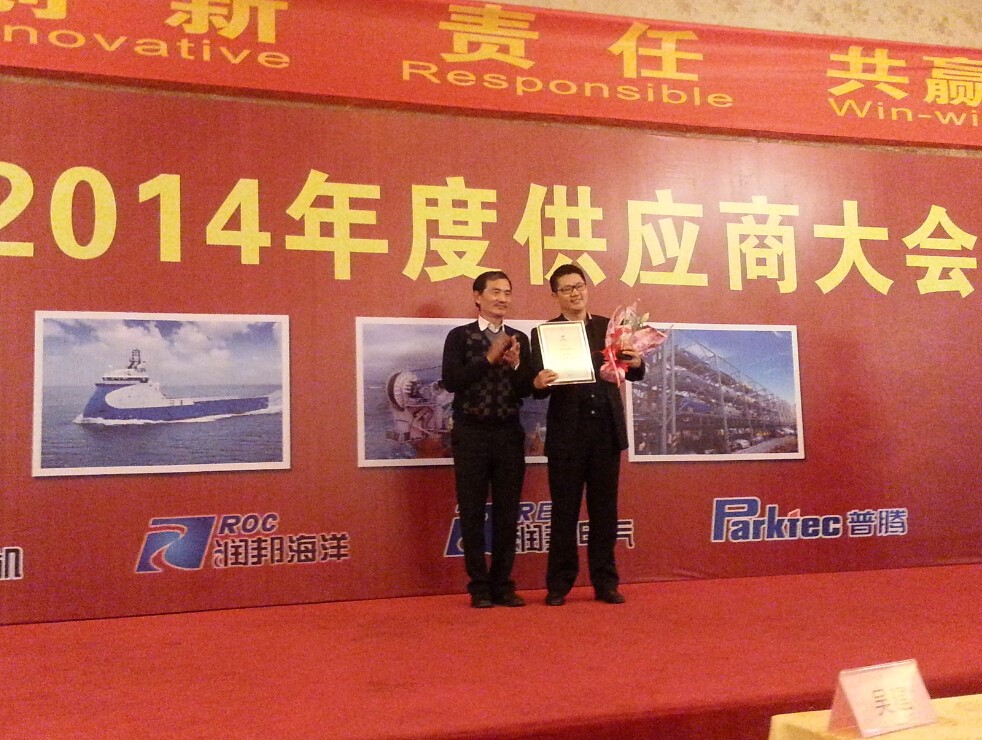 新年伊始,南通润邦海洋工程装备有限公司2014年度供应商大会在江苏南通隆重举行,来自全国各地的150家供应商二百余名代表, 润邦股份董事长、总裁及相关负责人参加了此次盛会。在当晚最受瞩目的2014年度优秀供应商颁奖环节,利星行机械(上海)有限公司不负众望地获得了南通润邦海洋工程装备有限公司“2014年度优秀供应商”荣誉称号,利星行机械船舶动力部销售总经理洪波先生代表公司接受了这份荣誉并对进一步加强双方合作和共同捕捉商业机会进行了展望。