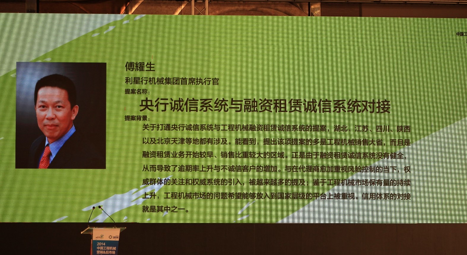 作为工程机械协会代理商工作委员会的常务副理事长,利星行机械集团首席执行官傅耀生先生也参加了此次盛会。傅耀生先生一直关注并积极致力于推动工程机械行业的健康发展,并于2012年出任首轮轮值会长,在此期间他提出了“培育中小代理商的成长发展”并主导开展了一系列中小代理商的培训和学习活动。本次会议中作为巅峰对话的首位发言嘉宾,他就如何推动“央行诚信系统和融资租赁公司诚信系统对接”发表了独特见解,引起与会者的强烈共鸣,获得了专家评审团的全票支持。此议题也被评为最受关注的三个议题之首,将被列为下一年度行业领导与相关政府部门沟通推进的工作重点。