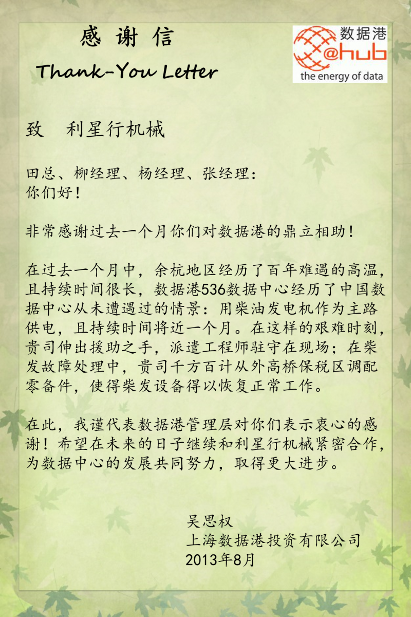 来自上海数据港投资有限公司的感谢信