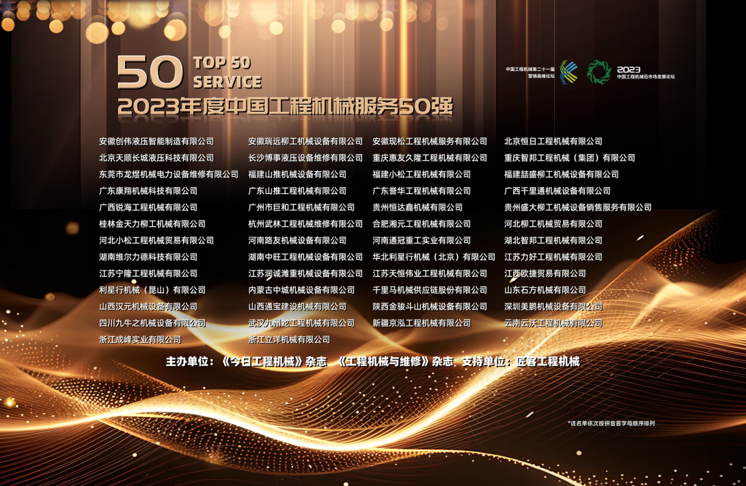 2023年10月18日,“2023年度中国工程机械年度服务50强”榜单在“亚运之城”杭州重磅发布。坚守工程机械服务价值,《今日工程机械》杂志、《工程机械与维修》杂志联袂推出“中国工程机械服务50强”评选。2023年度中国工程机械服务50强评选对象涵盖在中国工程机械市场上服务企业(包括代理商、技术服务商等),评选的核心标准为服务能力、服务质量和服务社会效益。利星行机械集团喜获殊荣,再次入围中国工程机械年度服务50强。