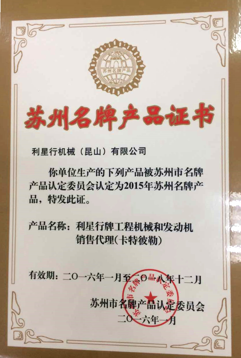 为了进一步深入实施名牌发展战略,增强苏州名牌市场竞争力,经苏州市名牌产品认定委员会认定,利星行机械荣膺2015年“苏州名牌产品”称号。 ..